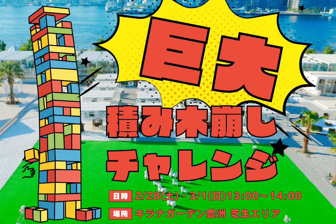 迫力が違う!全身を使って挑む「巨大積み木」がキラナガーデン豊洲の芝生エリアにやってきます。1チーム2〜3人で協力して、タワー崩壊の危機を乗り越えよう。